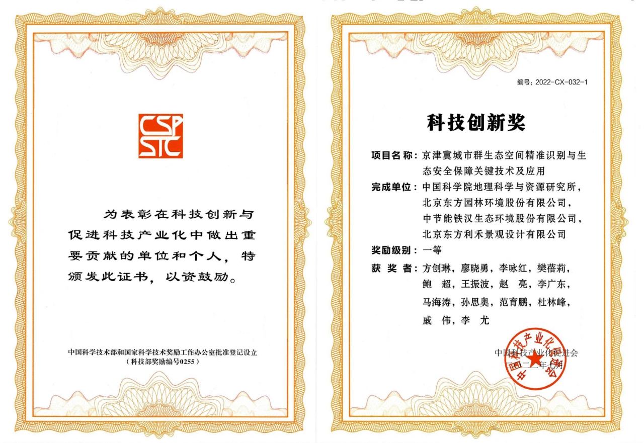 日前,中國科技產業化促進會正式頒發2022年度科技創新獎獲獎證書,由中節能鐵漢、中國科學院地理科學與資源研究所等單位聯合申報的《京津冀城市群生態空間精準識別與生態安全保障技術及應用》項目,榮獲2022年度科技創新一等獎。