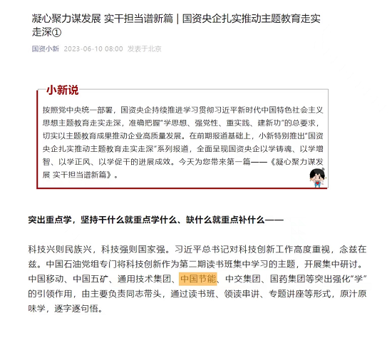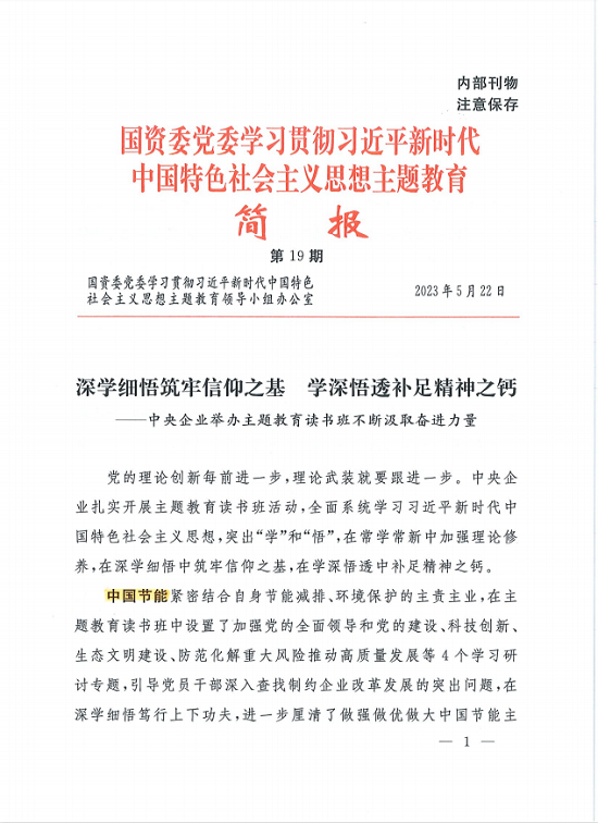 學習貫徹習近平新時代中國特色社會主義思想主題教育開展以來,中國節(jié)能深入學習領會習近平總書記重要講話精神,聚焦主題教育總要求和目標任務,堅持把主題教育同做強主責主業(yè)、建設人與自然和諧共生的中國式現(xiàn)代化緊密結合、一體謀劃,以強化理論學習指導發(fā)展實踐,以深化調(diào)查研究推動解決發(fā)展難題,高質(zhì)量開展主題教育,為企業(yè)發(fā)展凝心聚力。